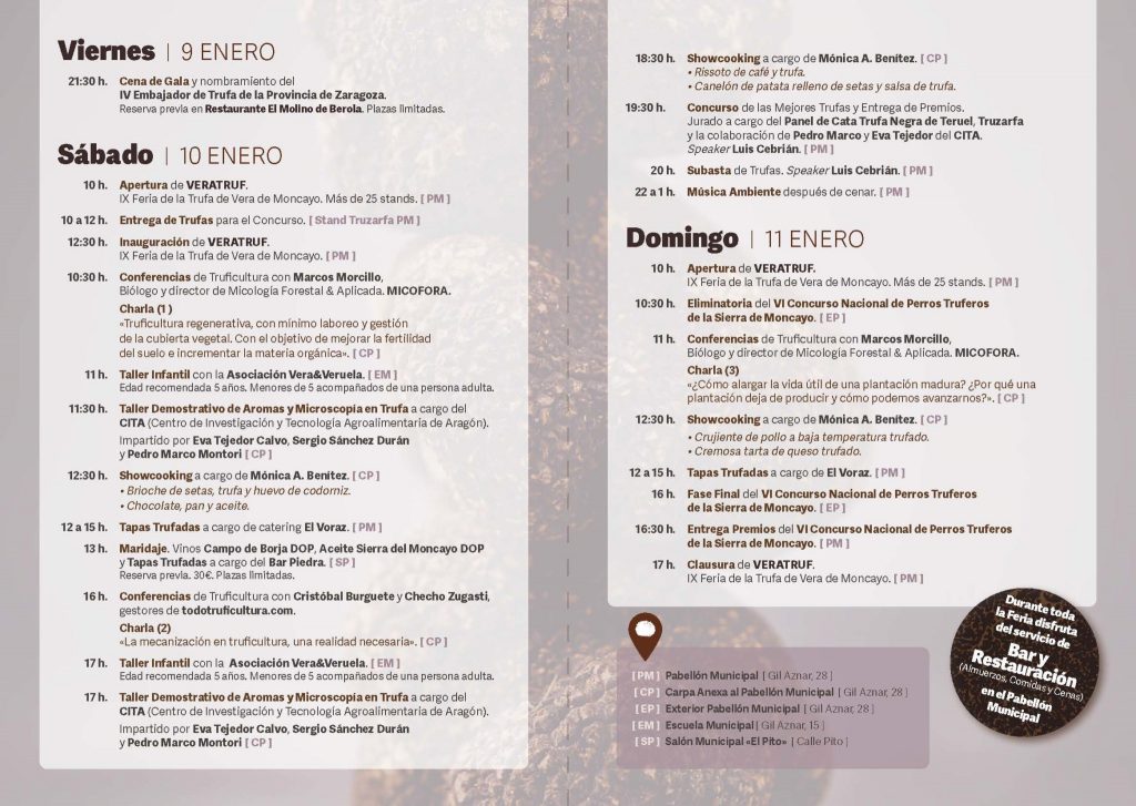 La feria contará con una treintena de expositores, ocupando todo el espacio disponible, y repetirá el formato de años anteriores: venta de trufa fresca, exposición y un amplio programa de actividades que incluye charlas técnicas, maridajes de vino y trufa, talleres infantiles, tapas trufadas y propuestas gastronómicas durante los dos días.