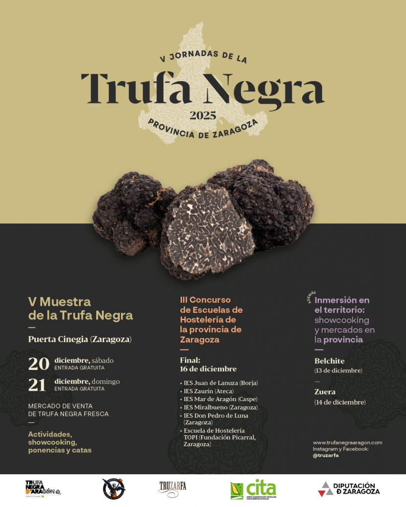 - El 20 y 21 de diciembre se celebrará en el Mercado de Puerta Cinegia la V Muestra de la Trufa Negra de la Provincia de Zaragoza, una cita especializada sobre Tuber melanosporum que contará con diferentes actividades en torno a este ingrediente