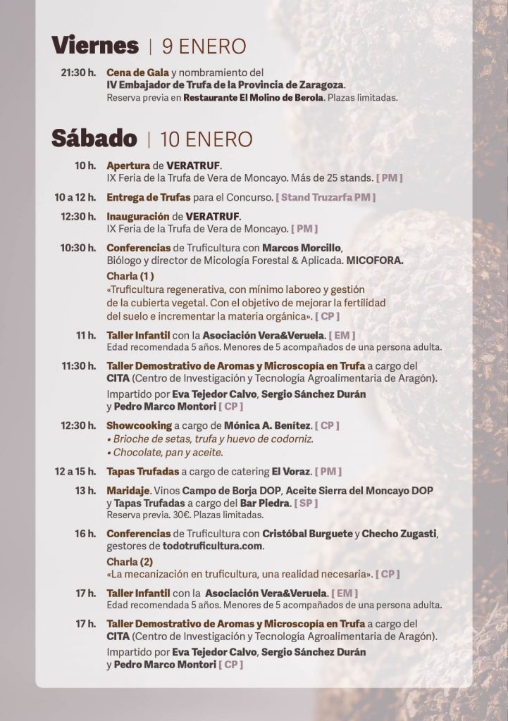 El programa arrancará el viernes 9 de enero con una Cena de Gala y el nombramiento del IV Embajador de la Trufa de la Provincia de Zaragoza. Durante el fin de semana, la feria contará con más de 25 stands, conferencias técnicas sobre truficultura, talleres infantiles y demostrativos, showcookings, tapas trufadas, catas, subasta de trufa, música ambiente y el VI Concurso Nacional de Perros Truferos de la Sierra de Moncayo.